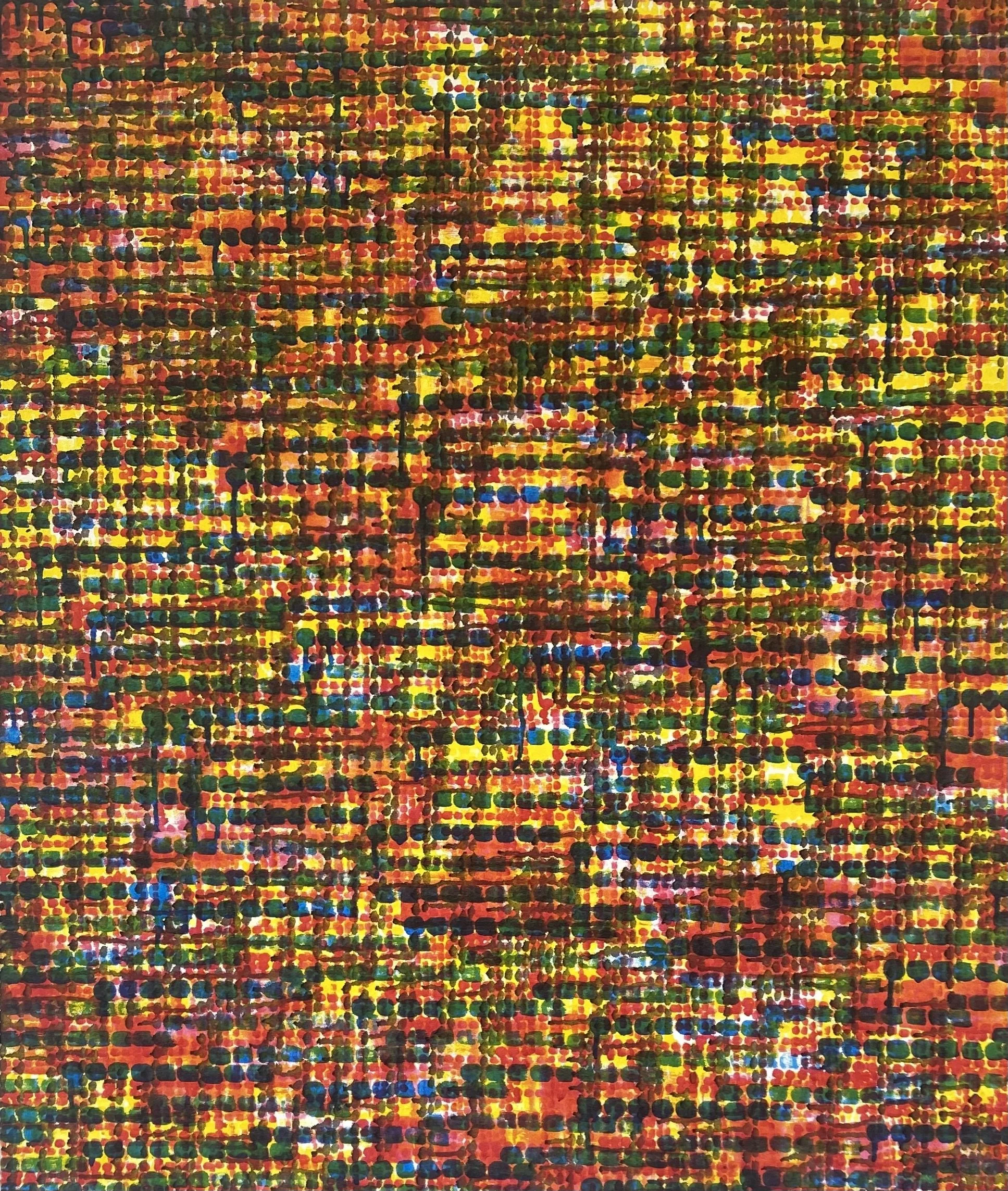 Taxidermy, yarn, faux fur, organza, and lame’ on canvas